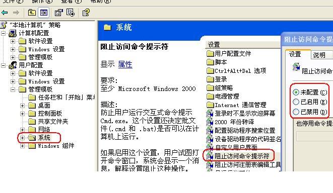 试一试:在“开始”→“运行”→输入“gpedit.msc”回车→进入“组策略编辑器”后,找到“用户配置”→“管理模板”→“系统”→“阻止防问命令提示符”→双击它→参见下图红框中所示→再选择→启用→应用→未配置→应用→这样来几个回合。