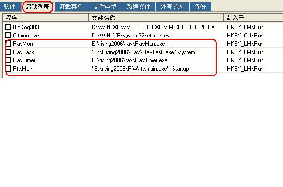 在安装完瑞星后先暂时不忙启动系统,先在“开始菜单”→“运行”→输入“msconfig”回车→进入“系统配置实用程序”→击“启动”卡如图所示检查下瑞星的启动项目里的项目后面的参数都有那些,有可能有一项就是在启动之后要删除它的文件,找到它去掉那项的钩选项。看看能否解决问题