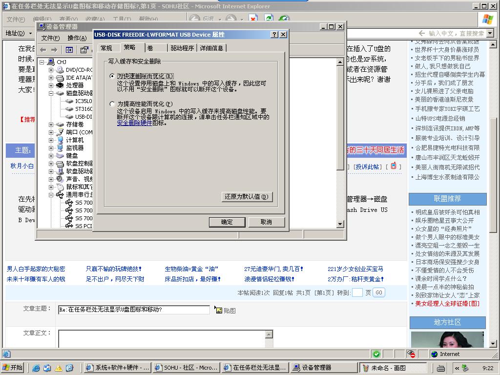 先将闪存插到USB接口,然后在Windows中用鼠标右键单击“我的电脑”图标,依次展开“属性→硬件→设备管理器→磁盘驱动器”,找到“USB Flash Drive USB Device”(不同品牌的闪存名称可能不同),然后双击它打开“USB Flash Drive USB Device属性”对话框或者右击它选择属性。切换到“策略”选项卡,选中“为提高性能而优化”,单击“确定”退出