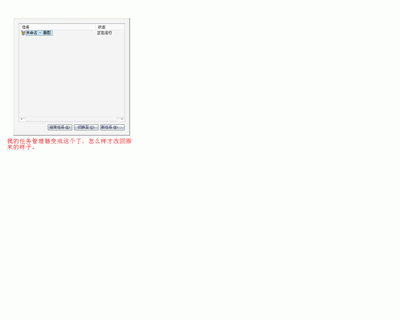 ,我的WINXP2自带的任务管理器突然变成这样了,如图所示,请大家告诉我怎么样才能变回原来的样子。现在就是一个空白的上面的工具条全没了。