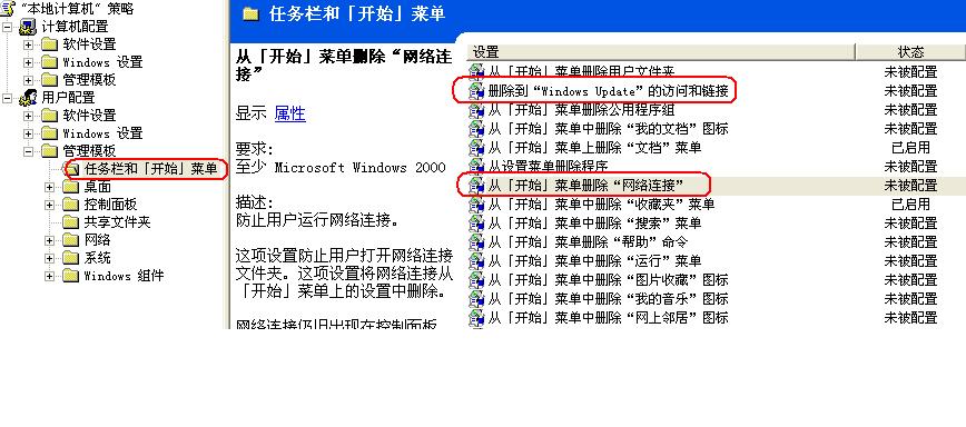 试一试:在“开始”→“运行”→输入“gpedit.msc”回车→进入“组策略编辑器”后,找到“用户配置”→“管理模板”→“任务栏和开始菜单”项,→参见下图