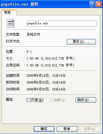 有个疑问.我的机器一直都是把"隐藏"关了的.以前从来没发现过这个文件啊.虚拟内存确实在G盘没错.但是,以前我从来没见过有这个文件存在.呃~~~不过,我昨天用"超级兔子"对内存进行过一次整理.
