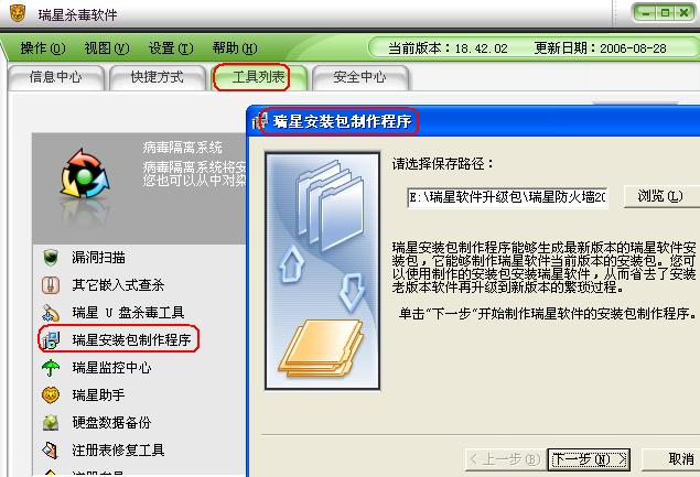 在瑞星的程序组里有防火墙的安装制作包程序在它的文件夹里的“Rfw\BackRav.exe”参见下图