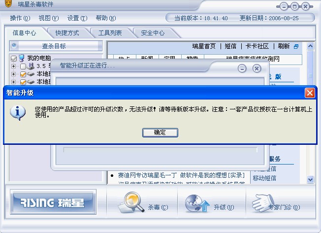 等下一个版本再升级。瑞星为正版用户每个版本提供3次升级, 这个版本你已经升级过三次了,下个版本再升级吧,我和几个人同用一个瑞星,也没问题,有时候也会出现这个问题,只好等下个版本再升级了。