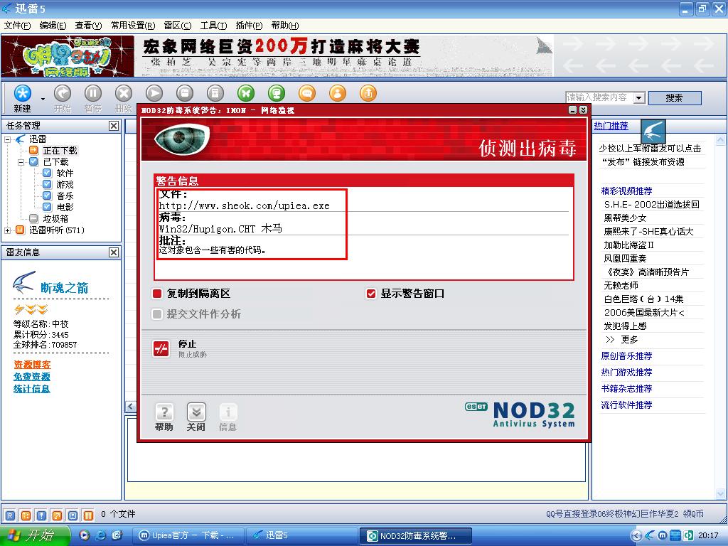 各位用过‘upiea’这款软件吗??如果你有这款软件,依我之见,你还是赶快把它删了吧!!为什么??因为这是一个木马程序。我用过金山毒霸2006对它进行扫描,并没有说它是病毒程序,但是用NOD32这款杀毒软件进行扫描,报告说这是一个木马程序!!