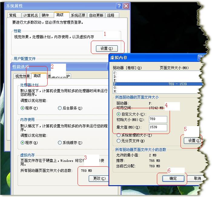 如果你的硬盘空间够大,你也可以自己设置虚拟内存,具体步骤如下:右键单击“我的电脑”→属性→高级→性能 设置→高级→虚拟内存 更改→选择虚拟内存(页面文件)存放的分区→自定义大小→确定最大值和最小值→设置。一般来说,虚拟内存为物理内存的1.5倍,稍大一点也可以,如果你不想虚拟内存频繁改动,可以将最大值和最小值设置为一样。