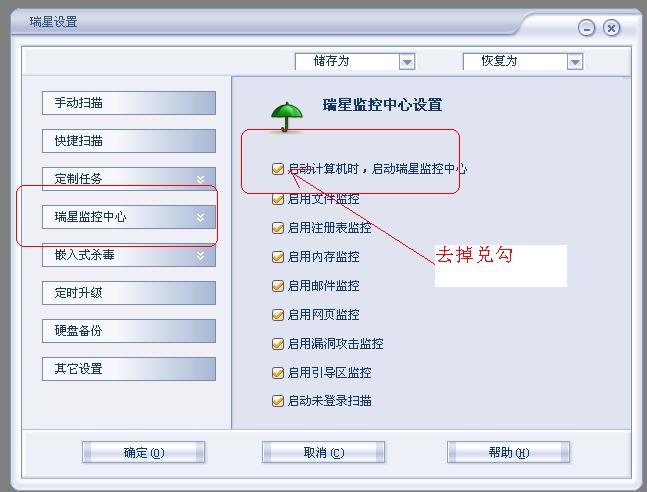 我试过关掉瑞星监控也不能关掉瑞星的后台钩子程序