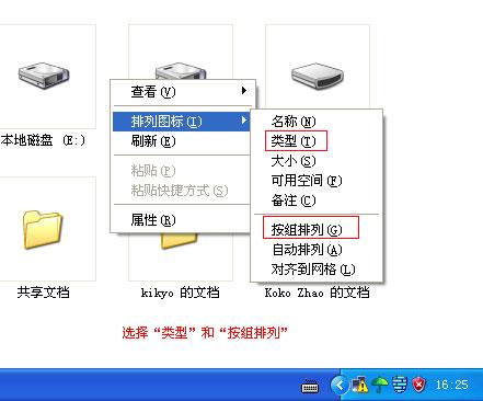 不仅要右键点击“查看—>平铺”,还要接着点击右键菜单栏里的“排列顺序—>类型”和“排列顺序—>按组排列”。