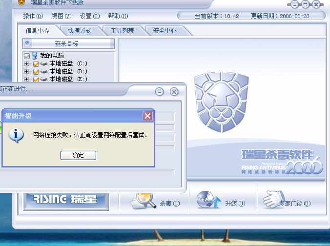 我下载了瑞星下载版也用手机支付了为什么点升级会提示网络连接什么的,请更改网络设置?
