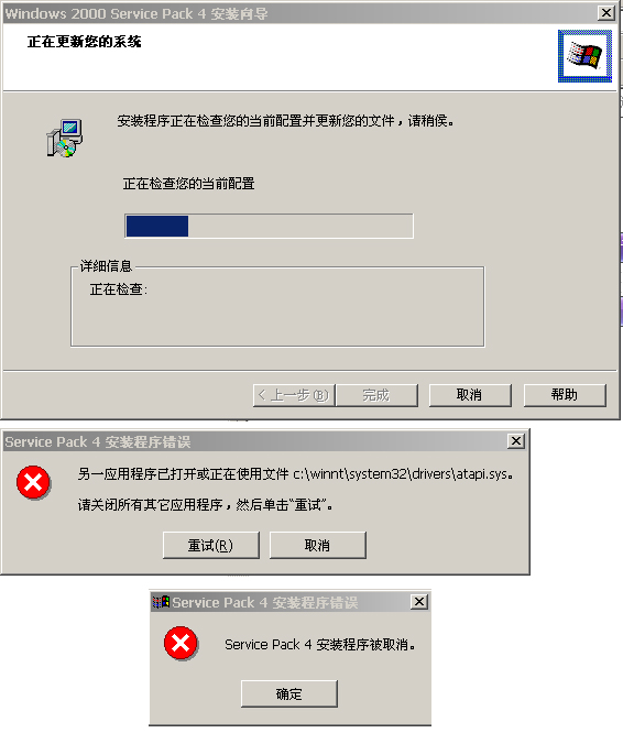 为什么我的电脑装不了win2000servive pack4 。烦死了,用瑞星系统漏洞扫出好多漏洞。下载了,可是更新不了,说要先安装pack4 所以就下了个pack4来装,可是总是出下以下问题(见图:总是报出有程序正在使用atapi.sys这个文件,可是我明明把所有的程序都关掉了,怎么还是会出现这个问题呢,在安全模式也试过了,出现同一样的问题,555),,有高手帮我解解吗,,谢谢啦,在线等,