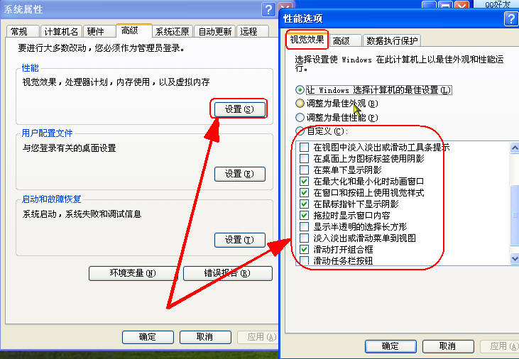 “电脑不能复制粘贴”可能注册表受损?有备份吗?如有用备份还原,“桌面不能显示透明了”可能是设置问题?试试鼠标指到→“我的电脑”击右键→“属性”→ “高级”→ “设置”如图红框中所示
