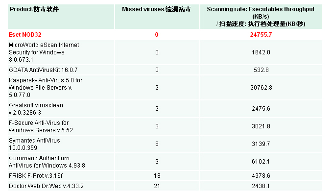 2006 年 10 月,NOD32 第 40 次通过Virus Bulltein的VB100%病毒测试,成为全球唯一能通过40 次VB100%测试之防毒软件。根据 Virus Bulletin 的报告,受测试的 20 多套防毒软件中,只有 3 套能够做到 100% 扫除病毒,而NOD32正是其中之一。NOD32在VB100%测试中,除了没有遗漏任何病毒外,扫瞄速度更稳占榜首,执行档处理量每秒高达24755.7 KB,无论在任何工作平台上都能以最短时间扫瞄最多档案,扫瞄效率无庸置疑。
