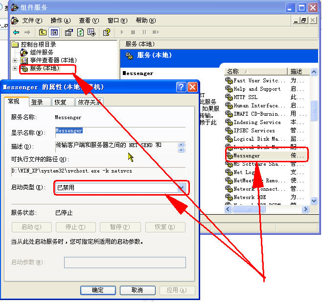 在“开始”→“运行”→输入“%WINdir%\system32\Com\comexp.msc”打开“组件服务”在“服务(本地)”项里找到“Messenger”项目双击它设置为“禁止”即可参见下图片红色框中所示