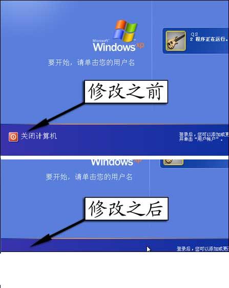 现在,再点击“Windows+L”锁定计算机看看,左下角的“关闭计算机”按钮是不是已经消失得无影无踪了(如图),上面是设置前的锁定计算机界面,下方的设置后的锁定计算机界面。
