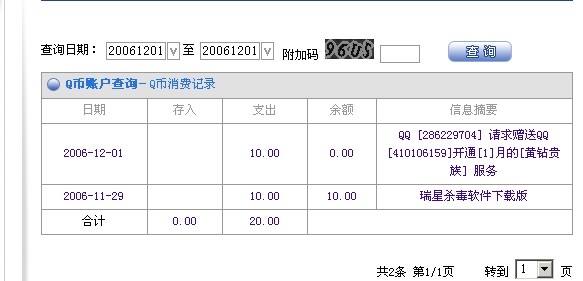 昨天我冲了20员的QQ币,今天中午来续费点了续费后(中间没有上QQ也没上网更没帮人冲什么)上QQ主业看了下消费为什么会多出一条:2006-12-01 10.00 0.00 QQ [286229704] 请求赠送QQ[410106159]开通[1]月的[黄钻贵族] 服务 而且我是2006年12点30到55间点的蓄费为什么这上面写的2006-11-29 10.00 10.00 瑞星杀毒软件下载版 能告诉我为什么吗?10员钱就这么没的了?