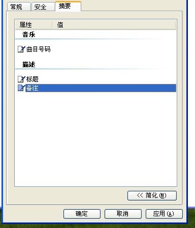 不知道为什么只要查看属性摘要就如图中一样,高级里面只有几个改动选项,正常应该是有标题主题作者什么的都能编辑现在都没了,不过在播放软件里显示的文件名歌手名什么的都可以显示出来,请高手帮帮忙解决下