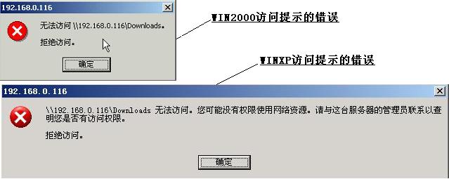 WINXP操作系统根据网络不能访问的几大设置都已经全部检查,还是不能网络访问,分别用WIN2000和WINXP访问,出现如下提示: