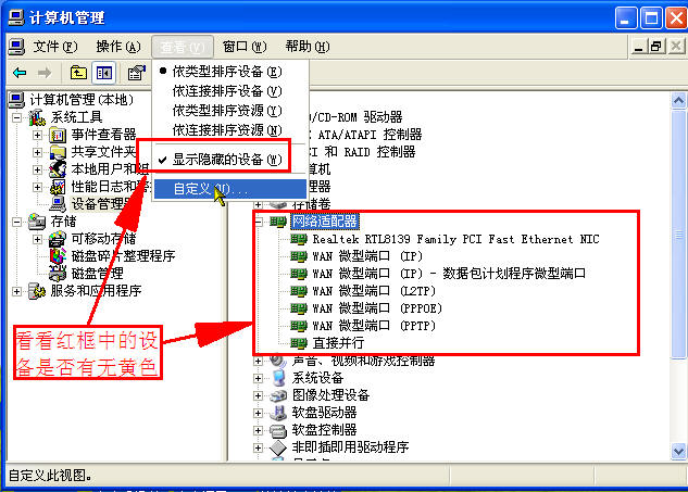 检查一下设备管理器里在“设备管理器”中鼠标指到“我的电脑”击右键选择“管理”→“设备管理器”→选择“查看→显示隐藏的设备”就能显示所有被隐藏的设备了参见下图片