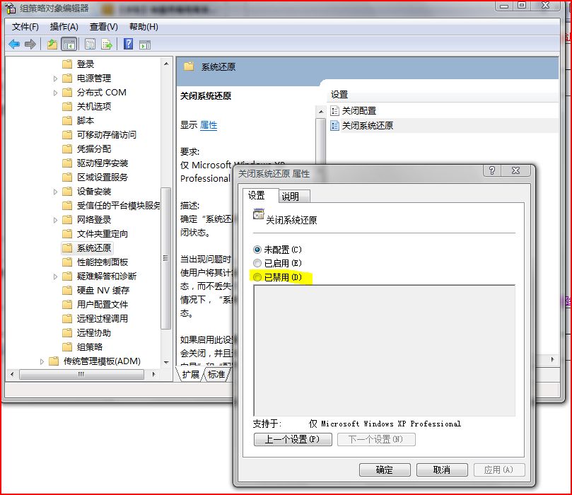 组策略控制台-计算机配置-管理模板-系统-系统还原中-关闭系统还原-禁用策略