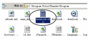 进入迅雷安装目录“X:\Program Files\Thunder\Program”(“X”为迅雷所在分区的盘符),找到“download.cfg”文件(如图1),然后用记事本打开该文件。