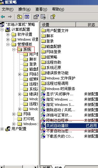 找到”关闭自动播放”那一项,启用并选择”在所有驱动器上禁用”.注意该设置会将光驱也关闭自动播放,但不会关闭CD自动播放歌曲.