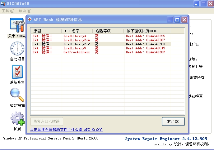 RVA 错误: GetProcAddress (危险等级: 高, 被下面模块所HOOK: Dest Addr: 0xAA54BE8F)
