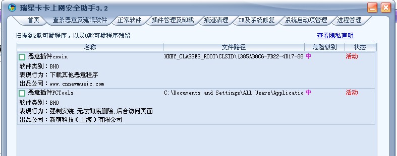 用卡卡杀了N次根本无法删除这两个恶意插件,希望能够解决。每次启动都出现这两个插件,修改我的主页,经常弹出广告。。郁闷~~
