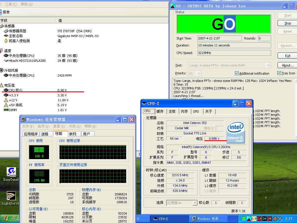 每降压一次运行10分钟的SP2004进行系统稳定性测试!