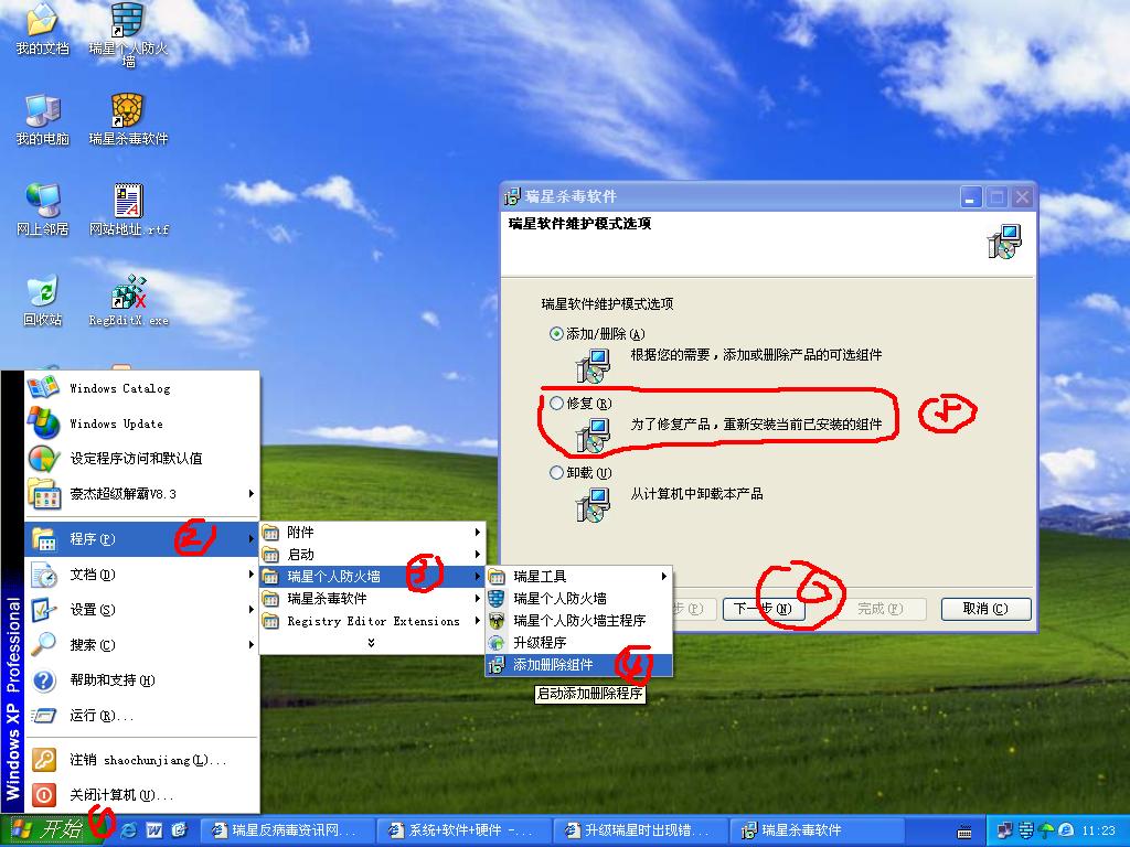 在升级瑞星时系统出现错误,再次升级时提示"读取升级配置文件失败,请使用安装程序的修复功能修复后再升级"可是根本找不到有一个修复功能,请那位高手,或者GM帮下忙,提示下怎么办,请麻烦清楚点,我是新手,谢谢!