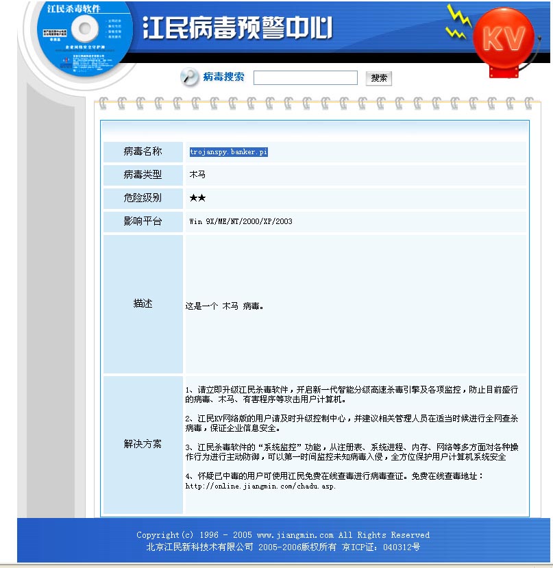 本人是瑞星的老用户,近日单位杀软(江民)查出一个压缩文件里有个木马“trojanspy.banker.pi”到瑞星网站一查,没有这个记录。