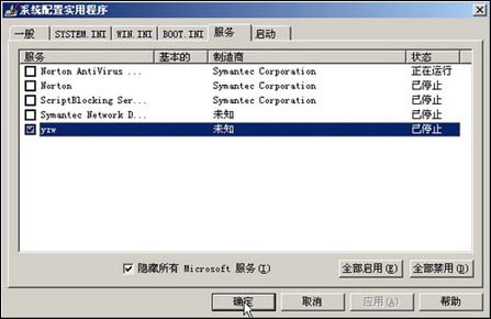 要启动停止的服务,在服务名前打上小钩即可启动。勾选“隐藏所有Microsoft服务”,此时列出的就是其它软件注册的系统服务,通过“制造商”大体可以判断出服务是否是病毒/木马,如笔者电脑上的“Norton Antivirus自动防护服务”,制造商为“Symantec Corporation”(赛门特克公司),就是诺顿杀毒软件注册的服务,而“YZW”这个服务则极为可疑,经检查它正是一个木马。