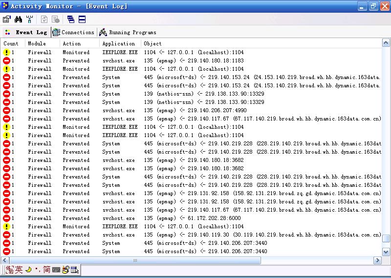 我的防火墙阻止了那些企图通过我的135、445、139端口和我机“握手”(连接)的企图,(红色标志部分)。而提示中可见,这些企图都是来自本地城市的电信局的宽带163信息港。我要问的事:既然当我们把与这些官方的、正经的连接或“沟通”企图都阻止时,我们的上网和一切电脑活动都能正常、健康的进行;这些连接看来并非上网所必需的;那么这些电信的宽带信息港总要和我们的机连接或沟通究竟是要干什么呢?