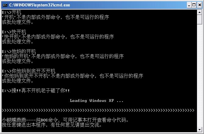 画面相信大家都见过,可你知道如何写代码吗? 不同人有不同方法实现,我用DOS命令。 @echo off :::::::::::::::::::::::::: :生成vbs脚本,用来显示动画 echo CD=Wscript.Arguments(1)>showplan.vbe echo Str=Wscript.Arguments(0)>>showplan.vbe echo Time_Delay=Wscript.Arguments(2)>>showplan.vbe echo Switch1=Wscript.Arguments(3)>>showplan.vbe echo Switch2=Wscript.Arguments(4)>>showplan.vbe echo Str_Len=len(Str)>>showplan.vbe echo Show_Str Str,Str_Len,CD,Time_Delay,Switch1,Switch2>>showplan.vbe echo wscript.stdout.write vbcrlf>>showplan.vbe echo Function Show_Str(str,strlen,CD,Speed,Switch1,Switch2)>>showplan.vbe echo IF Ucase(Switch2)=^"Y^" then>>showplan.vbe echo Show_Cursor 8,CD>>showplan.vbe echo End if>>showplan.vbe echo IF str^<^>^"^" then>>showplan.vbe echo For i=1 to strlen>>showplan.vbe echo if i mod 2=0 then>>showplan.vbe echo Cursor=^" ^">>showplan.vbe echo else>>showplan.vbe echo Cursor=^"_^">>showplan.vbe echo end if>>showplan.vbe echo IF i=strlen then>>showplan.vbe echo Cursor=^" ^">>showplan.vbe echo End if>>showplan.vbe echo IF Ucase(Switch1)=^"Y^" then>>showplan.vbe echo str1=str1 ^& ^"^>^">>showplan.vbe echo wscript.stdout.write chr(13) ^& CD ^& str1^&Left(str,79-i) ^& chr(8)>>showplan.vbe echo Else>>showplan.vbe echo wscript.stdout.write chr(13) ^& CD ^& Left(str,i)^&Cursor^& chr(8)>>showplan.vbe echo End if>>showplan.vbe echo wscript.sleep Speed>>showplan.vbe echo Next>>showplan.vbe echo Else>>showplan.vbe echo Exit Function>>showplan.vbe echo End if>>showplan.vbe echo End Function>>showplan.vbe echo Function Show_Cursor(Num,CD)>>showplan.vbe echo for i=1 to Num>>showplan.vbe echo if i mod 2=0 then>>showplan.vbe echo Cursor=^" ^">>showplan.vbe echo else>>showplan.vbe echo Cursor=^"_^">>showplan.vbe echo end if>>showplan.vbe echo wscript.stdout.write chr(13) ^& CD ^& Cursor ^& chr(8)>>showplan.vbe echo wscript.sleep 200>>showplan.vbe echo Next>>showplan.vbe echo End Function>>showplan.vbe :初始设置; set str1=开机 set str2=快开机 set str3=他妈的开机 set str4=你他妈到底开不开机 set str5=操!!再不开机老子砸了你!! set str6=不是内部或外部命令,也不是可运行的程序 set str7=或批处理文件。 set str8================================================================================ ::::::::::::::::::::::::::::::::::::::::::::::: :主控程序; cscript.exe showplan.vbe %str1% "%~dp0>" 120 "" "Y" //nologo call :Msg %str1% cscript.exe showplan.vbe %str2% "%~dp0>" 100 "" "Y" //nologo call :Msg %str2% cscript.exe showplan.vbe %str3% "%~dp0>" 180 "" "Y" //nologo call :Msg %str3% cscript.exe showplan.vbe %str4% "%~dp0>" 180 "" "Y" //nologo call :Msg %str4% cscript.exe showplan.vbe %str5% "%~dp0>" 80 "" "Y" //nologo cscript.exe showplan.vbe "" "" 100 "" "Y" //nologo echo Loading Windows XP ... echo. cscript.exe showplan.vbe %str8% "" 50 "Y" "" //nologo del showplan.vbe echo. echo 小蝴蝶燕燕----纯DOS命令,可用记事本打开查看命令代码。 echo 按任意键退出本程序,有任何意见请提出交流。 pause>NUL :Msg ping -n 2 127.0.0.1>nul echo '%1'%str6% echo %str7% echo.将红色代码复制到记事本,以bat格式保存即可