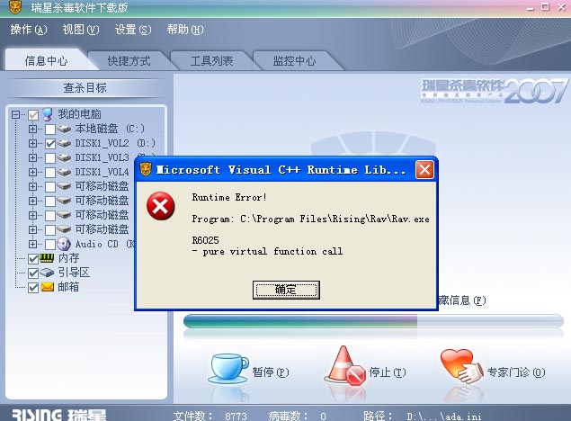 我的瑞星杀毒软件不知道怎么了,在杀D盘的时候,就断掉了,杀其它的盘都没问题.这个图片是我在单独杀D盘时,截下来的,请帮忙看一看是什么原因?谢谢.