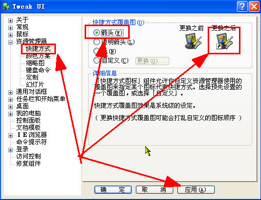 我近期用Ghost方式安装的系统的“快捷方式”图标与原文件图标一样,请教高手:怎样批量将快捷图标修改成右下角带箭头式图标?谢谢!