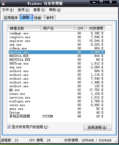 楼主你什么电脑里有东西,58个进程,帖个图上来。参考进程:如图(我图里蓝色部分和下面两个是打印机进程,你的没有打印机,应该没有。 30个进程也算多的拉,一般正常情况下就20来个左右~~~