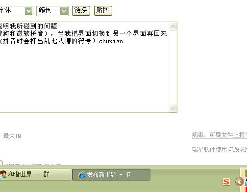 在当前界面我用中文输入法打字(搜狗和微软拼音),当我把界面切换到另一个界面再回来后,我就输入不了中文了,(用微软拼音时会打出乱七八糟的符号),如下图所示,我就只能打开一个记事本输入中文然后再粘贴过来,在上许多论坛时都会碰到这个问题,请大虾们帮助解决这个问题。