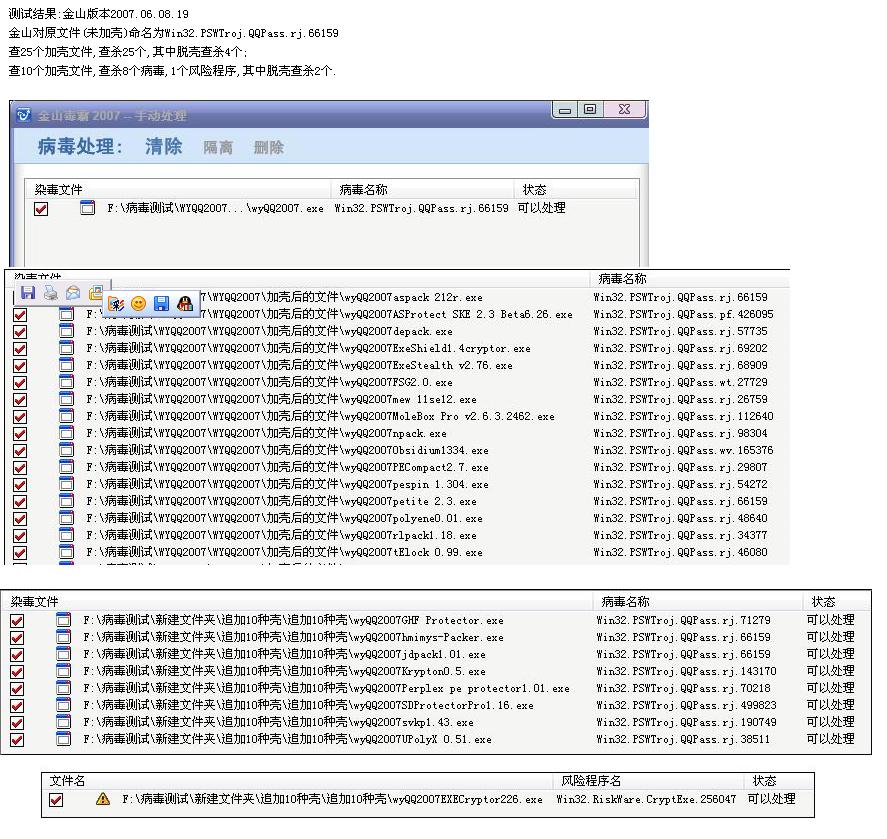 查10个加壳文件,查杀8个病毒,1个风险程序,其中脱壳查杀2个.