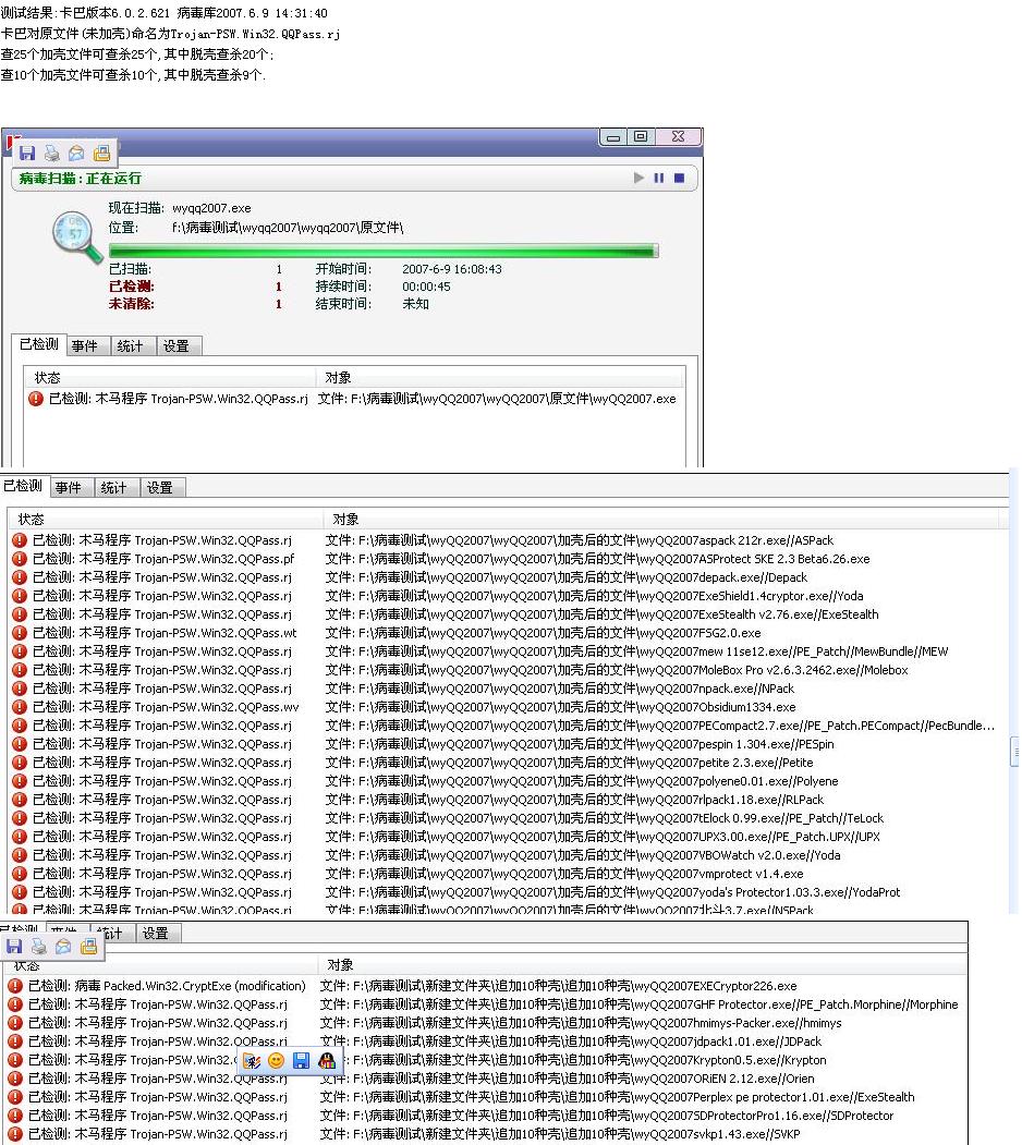 测试结果:卡巴版本6.0.2.621 病毒库2007.6.9 14:31:40