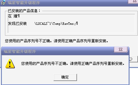我一安装就提示我机器里已经有瑞星老版本的存在,让我点下一步升级软件, 可是点了后又提示:您使用的产品序列号不正确,请使用正确的产品序列号! 可是它根本就不给我机会使用啊!