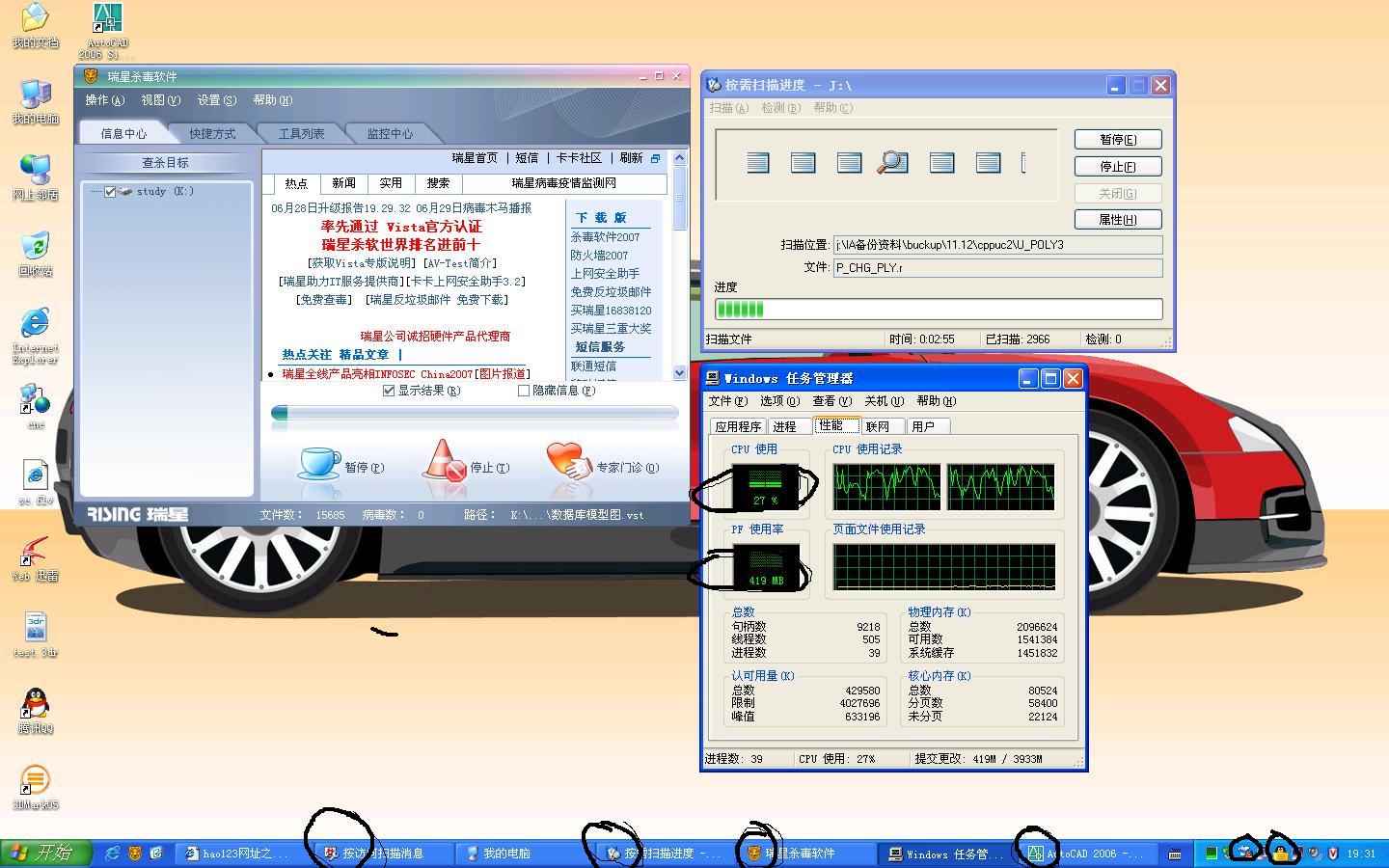 不羡慕,毕竟你圈出的好几个程序是不活动的,所以cpu占用率不能说明什么。双开杀毒我那台05的电脑也能做到。