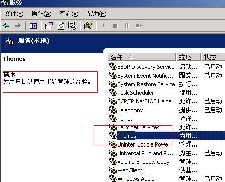 呵呵,好麻烦啊,在“我的电脑”右击——管理——服务和应用程序——服务,找到“Themes”就行了