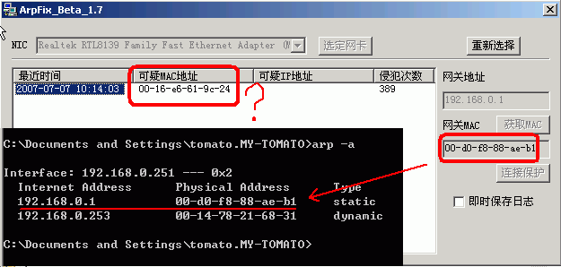 我用ARP保护程序扫描到可疑MAC地址的机子在攻击我。