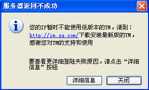 收到登录服务器登录第二步骤的回应,登录失败,原因:服务器返回不成功,提示信息: 您的IP暂时不能使用低版本的TM,请到:http://im.qq.com/下载安装最新版的TM,感谢您对TM的支持和使用