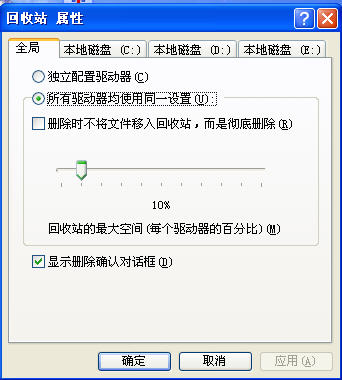 刚刚恢复GHOST,这才发现回收站的属性里面少了一个盘符,也就是说在其他各个分区里删除文件后,都会默认放到回收站里,唯独少了的那个分区删除文件时没有任何提示,是F盘,该盘没做隐藏,但在“我的电脑”里可以全部显示其各分区。