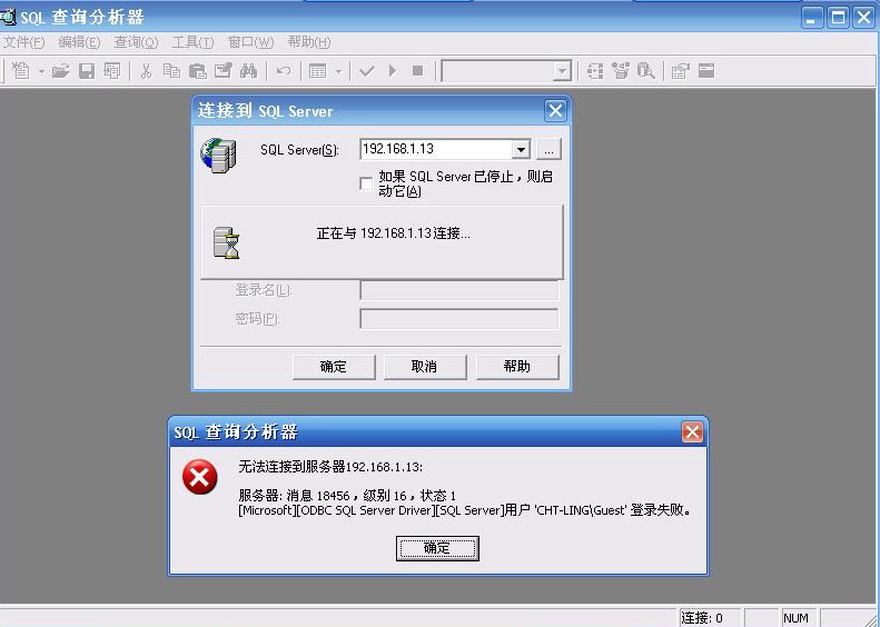 现在客户端无论怎样都连接不了A机的SQL,我以为要开启A机的GUEST帐户,但是开启后都是不能连接,两个SQL都没有设置密码,直接"WINDOWS身份验证". ............192.168.1.13是A机IP,192.168.1.14是B机IP