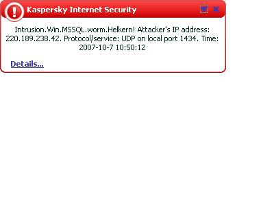 被偶一直认为是“瑞星特色”的这个1434端口扫描[那个瑞星称之为“蠕虫王攻击”的东东(?),]今天破天荒第一次看到Kis 6也发出了警告提示!
