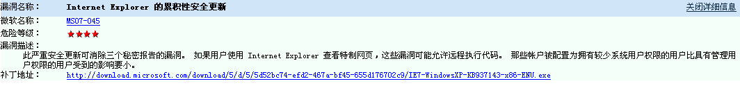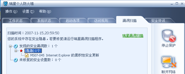 由于看到是属于危急性质的补丁,没有犹豫就在瑞星杀毒软件的漏洞扫描下选择了修复,直接下载安装上了补丁。安装完了之后,在瑞星的防火墙和杀毒软件漏洞漏洞扫描就没有发现漏洞了。