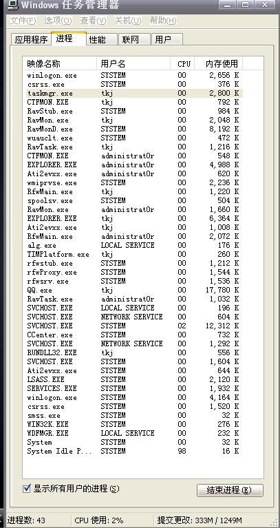 我电脑的进程总觉得有问题,进程太多了,多的时候有40多个,有些用户名我都不知道,帐户里面都没有,贴出任务管理器截图,请高手们指教一下!现在机器很慢,才配的新机,以前很快的,怀疑是中病毒,用最新瑞星查毒,查不到任何病毒!有什么办法能恢复请告知!