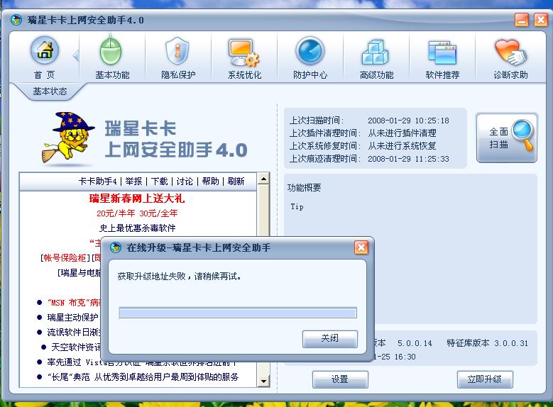 不知怎么的,突然我的瑞星卡卡软件不能升级了,当我要升级时它总是显示"攻取升级地址失败,请稍后再试",可我可以打开一些网页啊,比如卡卡社区,还有可以登录QQ,不过确实有些网页打不开,或打开了一半就打不开了,比如我进入了我的QQ空间,却打不开"日志",请高手们帮帮我,谢谢你们.